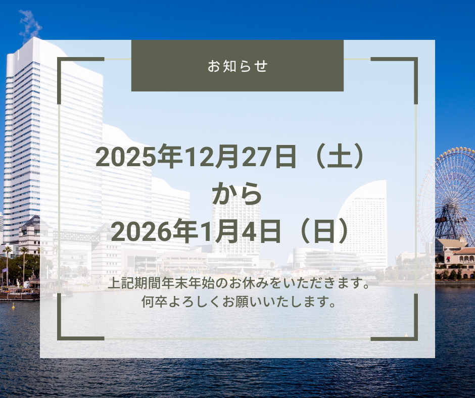 YOKEからのお知らせ みなとみらい事務所年末年始休館のご案内 YOKEからのお知らせ 2025/12/26 平素より当協会の活動にご理解ご協力を賜り、厚く御礼申し上げます。当協会みなとみらい事務所は、次の期間休館をなります。 2025年12月27日(土)から2026年1月4日(月) 2026年は1月5日(月)8:45から開館いたします。