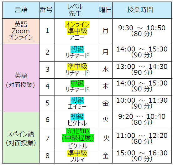 担当クラス:月曜初級、水曜準中級、木曜中級